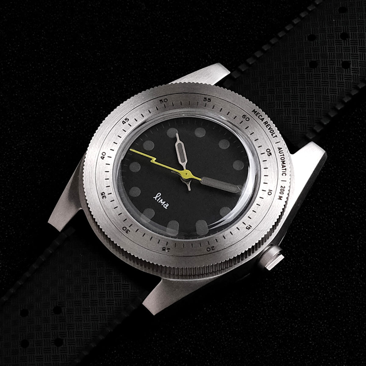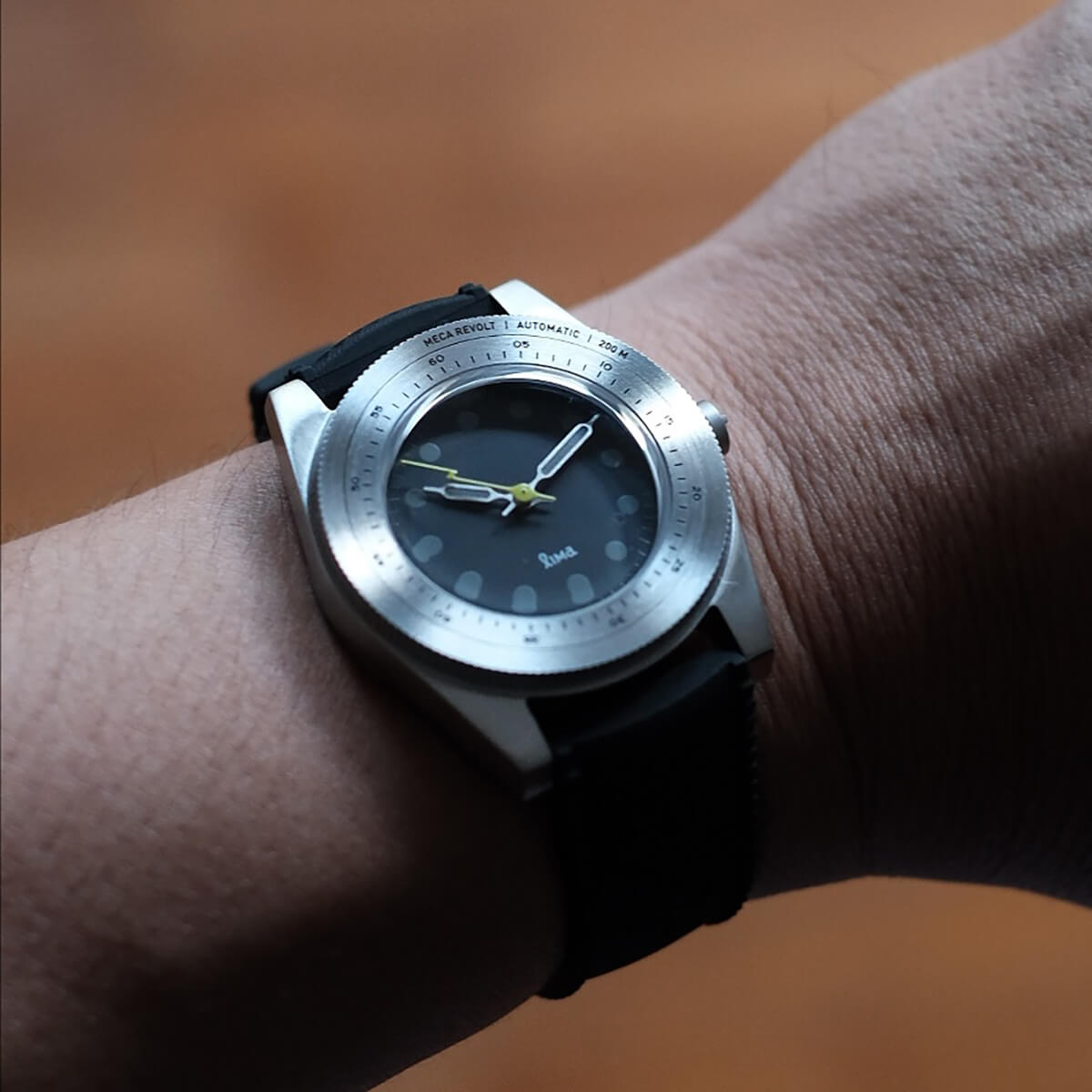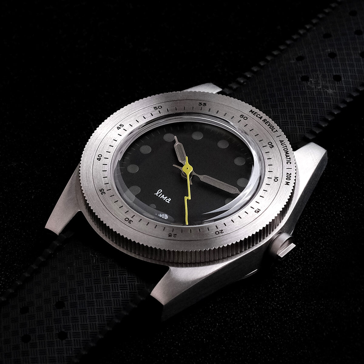 The latest MECA‑REVOLT introduces a silver bezel while retaining the bold black minutes scale.