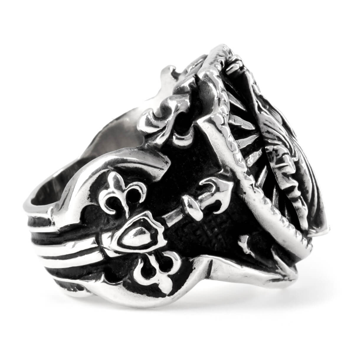 A ring intricately sculpted with a knight’s shield and sword, creating a strong medieval Gothic presence.