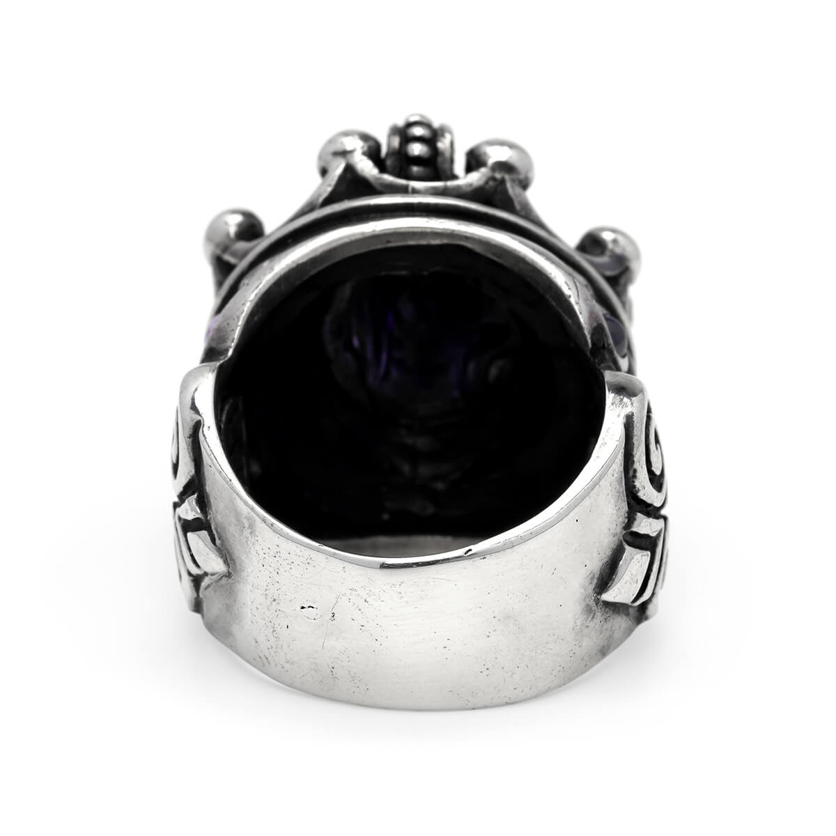 A striking three-dimensional ring combining the crowns of a king and queen, centered with a vivid gemstone.
