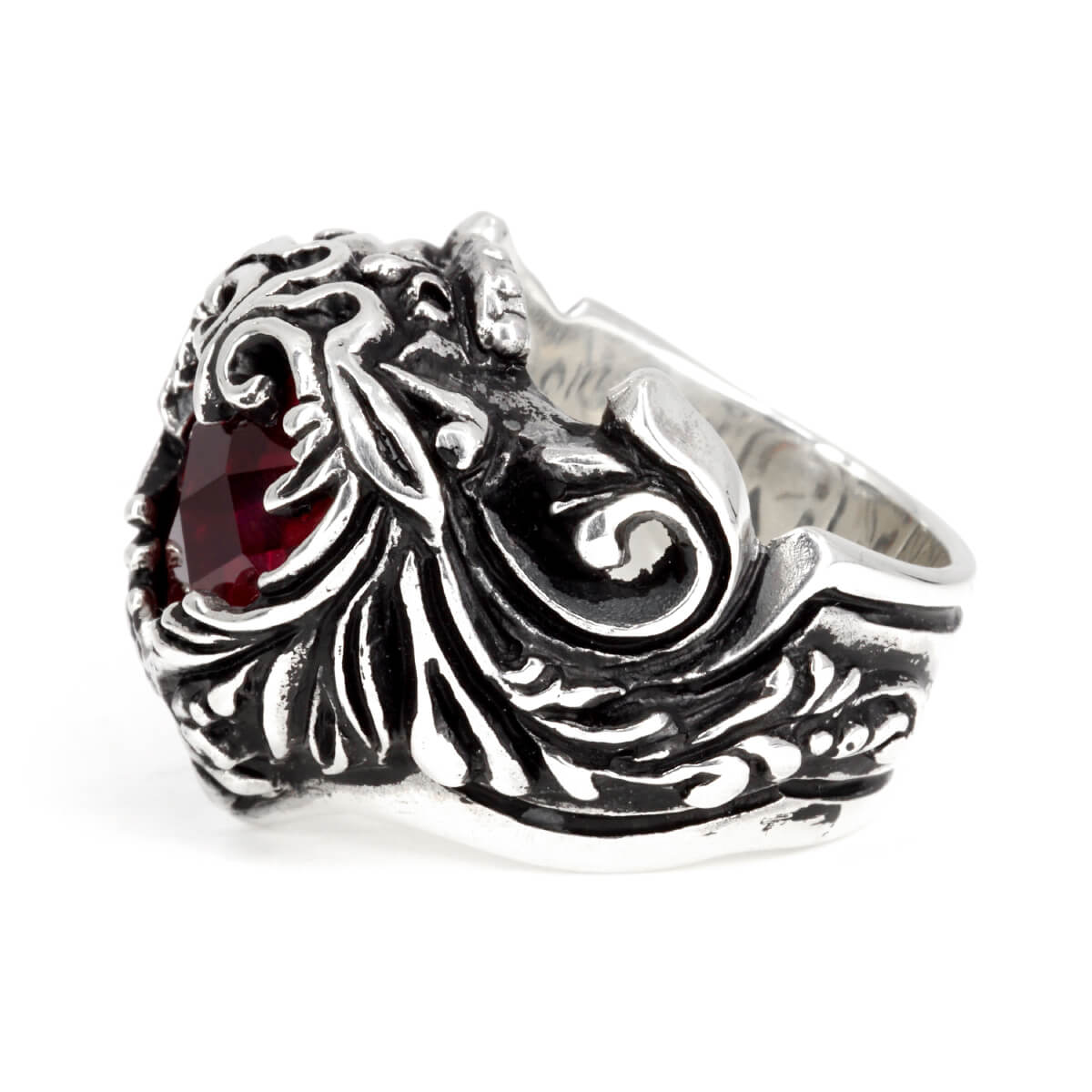 A ring featuring traditional Nordic scroll patterns, centered with a vibrantly colored gemstone set in a three-dimensional design.